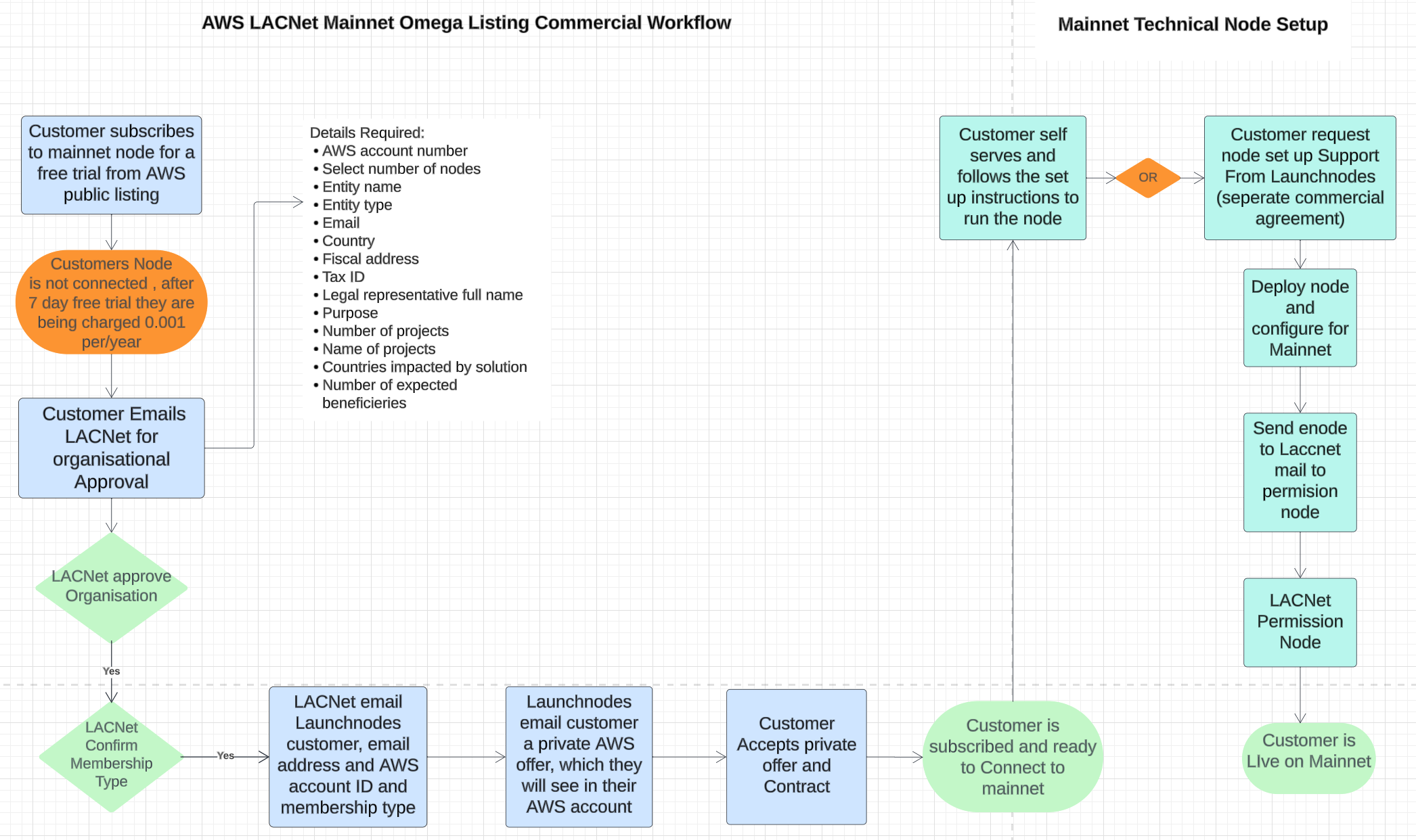 El diagrama de flujo de trabajo destaca los pasos que necesita para ser aprobado y la información que necesita compartir con LACNet y luego cómo compra su membresía en AWS y procede a configurar su nodo.