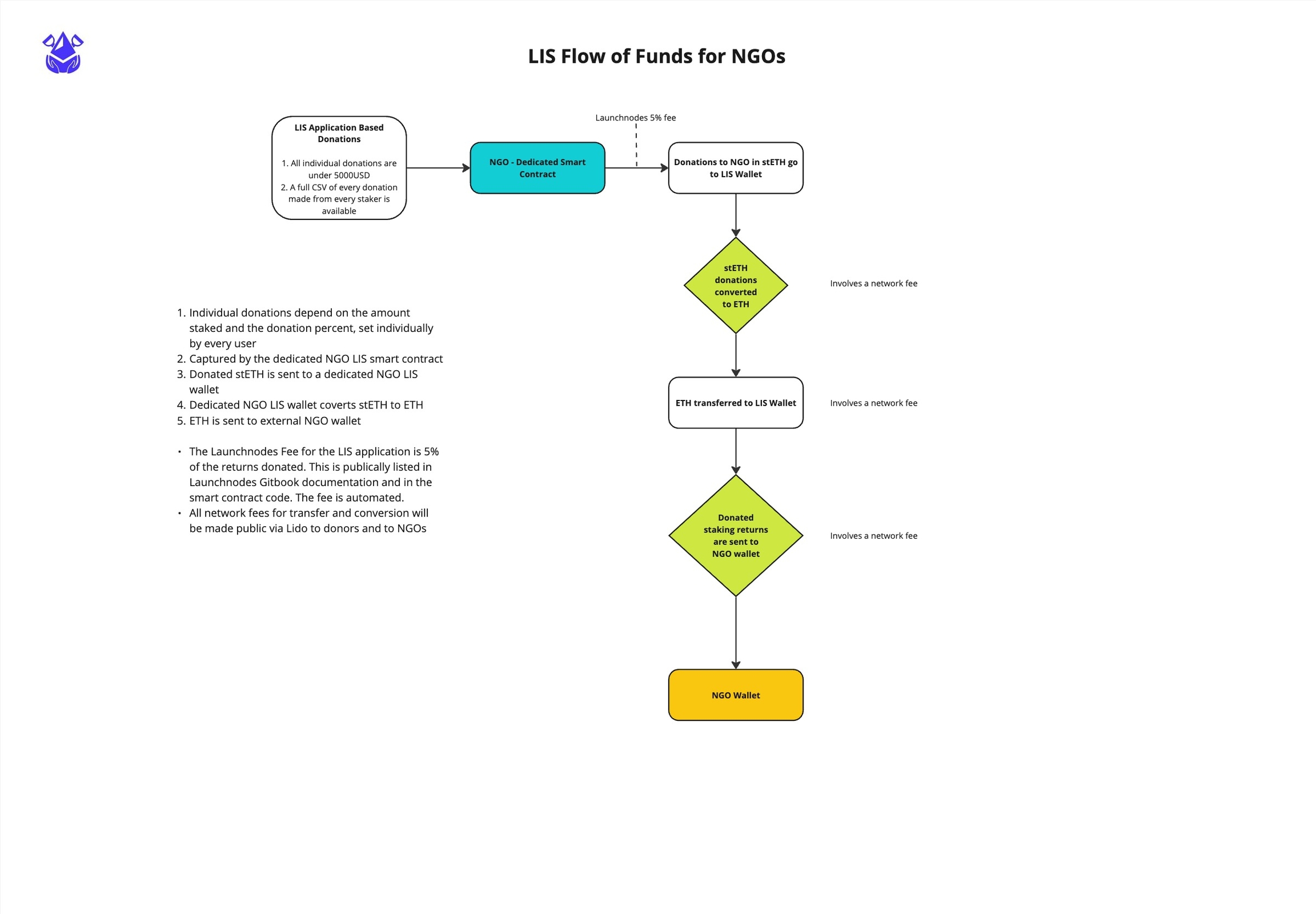 Once your project has been successfully onboarded to the Social Impact Marketplace, you will be asked to provide a wallet address capable of receiving stablecoins (USDT, USDC, or DAI). This address will be included in a smart contract enabled by Launchnodes, ensuring that any yield donated to your project is sent directly and securely, Launchnodes does not custody any donated funds.